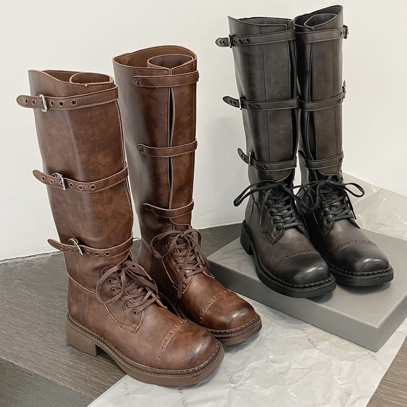 2025 Early Autumn Korean Version British Style Western Martin Boots for Women Thick Sole Casual Long Boots Versatile Lace-up Work Boots