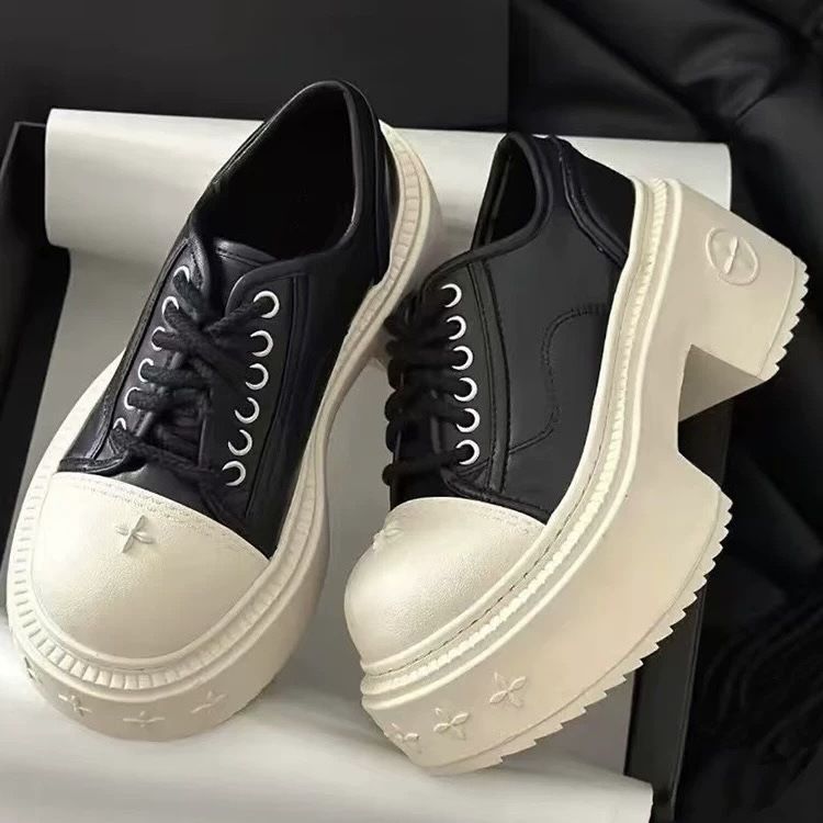 Top Plate Cross Flower New Low-top Cowhide Canvas Shoes Thick Sole Height-increasing Lace-up Casual Color-blocking Chunky Heel Big Toe Shoes