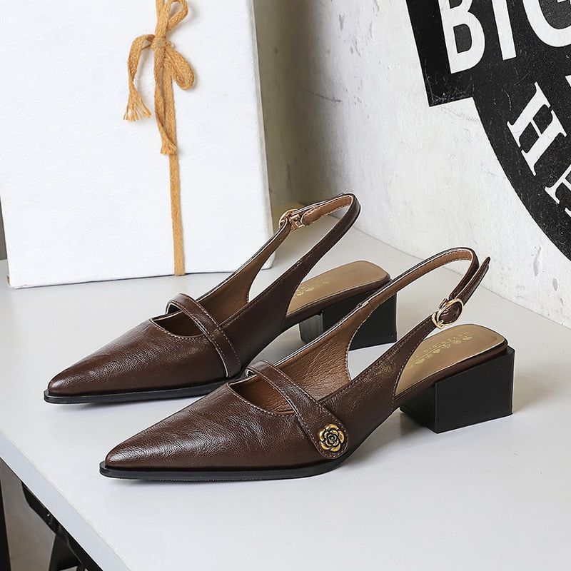 2838-7 Fashionable Brown Camellia Single Shoe With Wide Thick Low Heel, Empty Rear Hook Strap, Women's Shoes