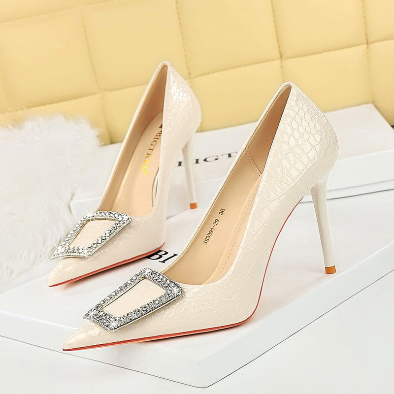 3391-K28 Korean Women's Slim Ultra High Heels Shallow Mouth Sharp Toe Lacquer Skin Snake Pattern Water Diamond Buckle