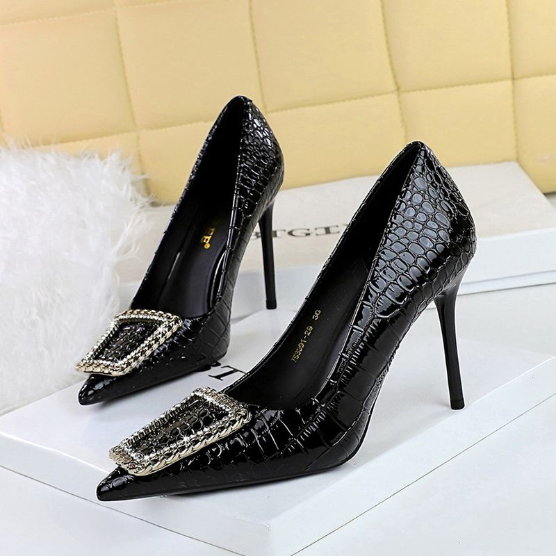 3391-K66 Style Banquet With Fine Heels, Stone Pattern, Patent Leather, Shallow Mouth, Pointed Toe, Rhinestone Buckle,