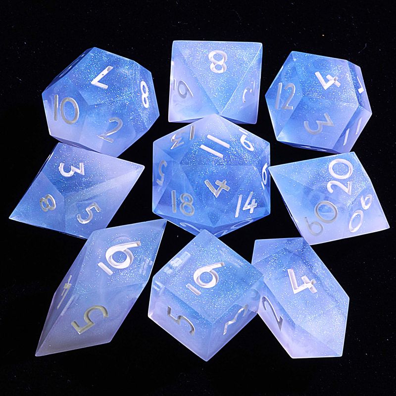 "The wyrm’s shadow is longer than its fangs." This DND dice set is named "First Snow of Star Dragonborn", where every roll captures the sacred moment when celestial dragon blood stirs within mortal flesh. When your silver-scaled paladin's prayer becomes winter's breath or your sorcerer's skin first shimmers with astral energy, these dice don't clatter - they crystallize, revealing your growing connection to the Astral Sea in delicate frost patterns. That imperfect roll? Merely your mortal form learning to wield the ancient power awakening within you. Product Features Each "Full Set of 9 pieces" includes: 1 x D4 (Crystal) 2 x D6 (1 Rhombus and 1 Cube) 1 x D8 (Pointier) 1 x D10 (Pointier) 1 x D% (Pointier) 2 x D12 (1 Rhombus and 1 Standard) 1 x D20 (Standard) Custom Requests: If you have a specific design in mind or need to change one of our dice sets, please contact us! We’re happy to accommodate your creative ideas. We have 21 dice types you can choose from; Click here to view them. If you do not want the "Full Set of 9 pieces" preset by us above, you can select any type and quantity from these 21 dice types. Handcrafted with Care: All dice sets are meticulously handmade by our skilled resin artists and undergo rigorous quality inspection to ensure they are visually stunning and perfect for casual play. Unique and One-of-a-Kind: Every dice set is unique—no two dice sets are exactly alike, making it truly special. Premium Quality and Design: Made with high-grade epoxy resin for durability and a smooth, glass-like finish. Sharp-edged construction ensures fair and random rolls, thanks to uniform sides and corners. Precise, polished edges enhance the three-dimensional look, making the dice stand out on any gaming table. Our handmade dice sets are the perfect way to bring your style to your tabletop role playing games. Perfect for Tabletop Gaming: Ideal for games like Dungeons & Dragons, Call of Cthulhu, Pathfinder, Kids on Bikes, Starfinder, The Strange, Numenera, and more! Handmade Perfection: Due to the handmade nature of these dice sets, minor imperfections may occur that do not affect functionality or aesthetics. We strive to deliver the highest quality with every set. Production Time: Each set takes 3-7 days to create, ensuring attention to detail and craftsmanship. *WARNING* Not a toy. Keep away from pets, children, and mouths—risk of injury or death.