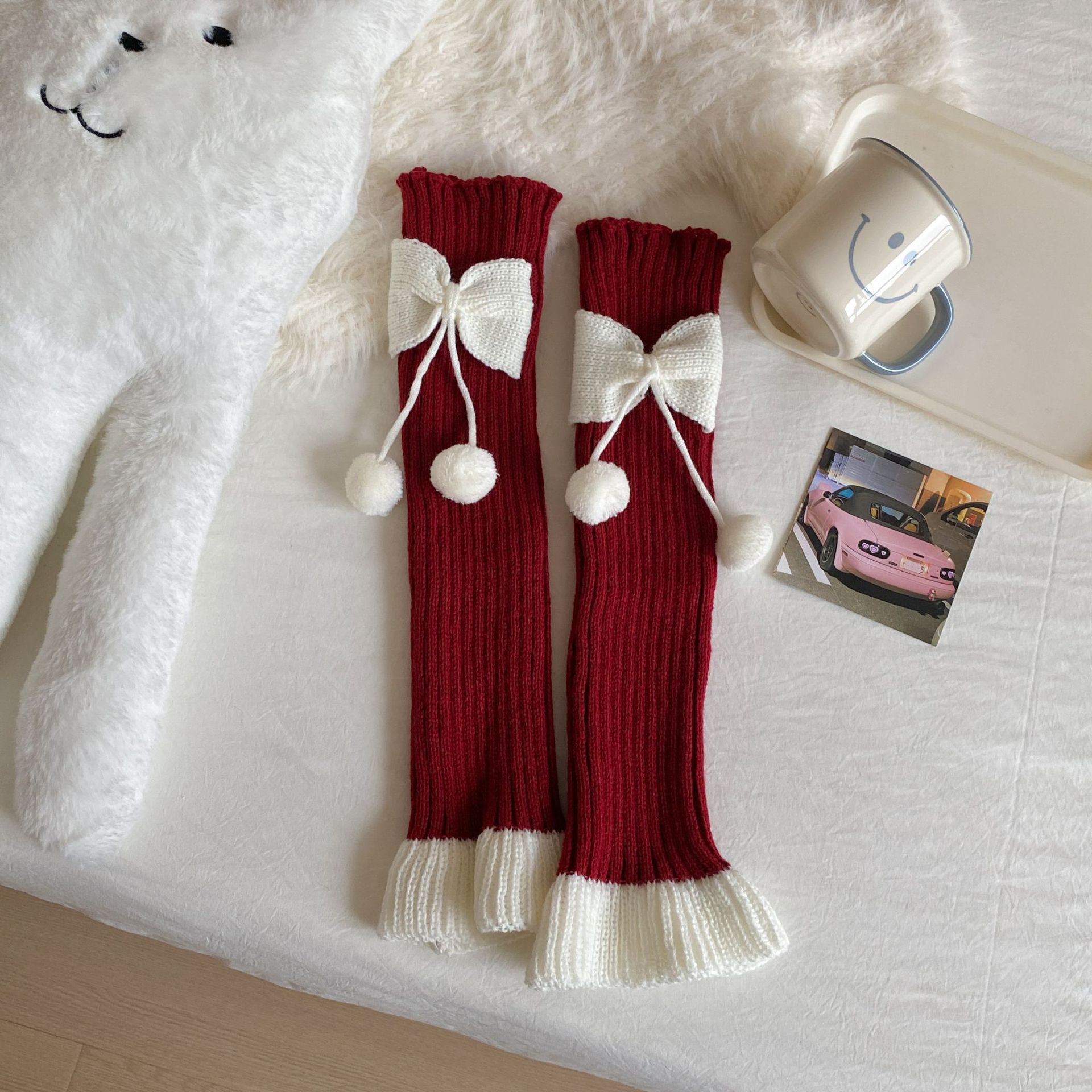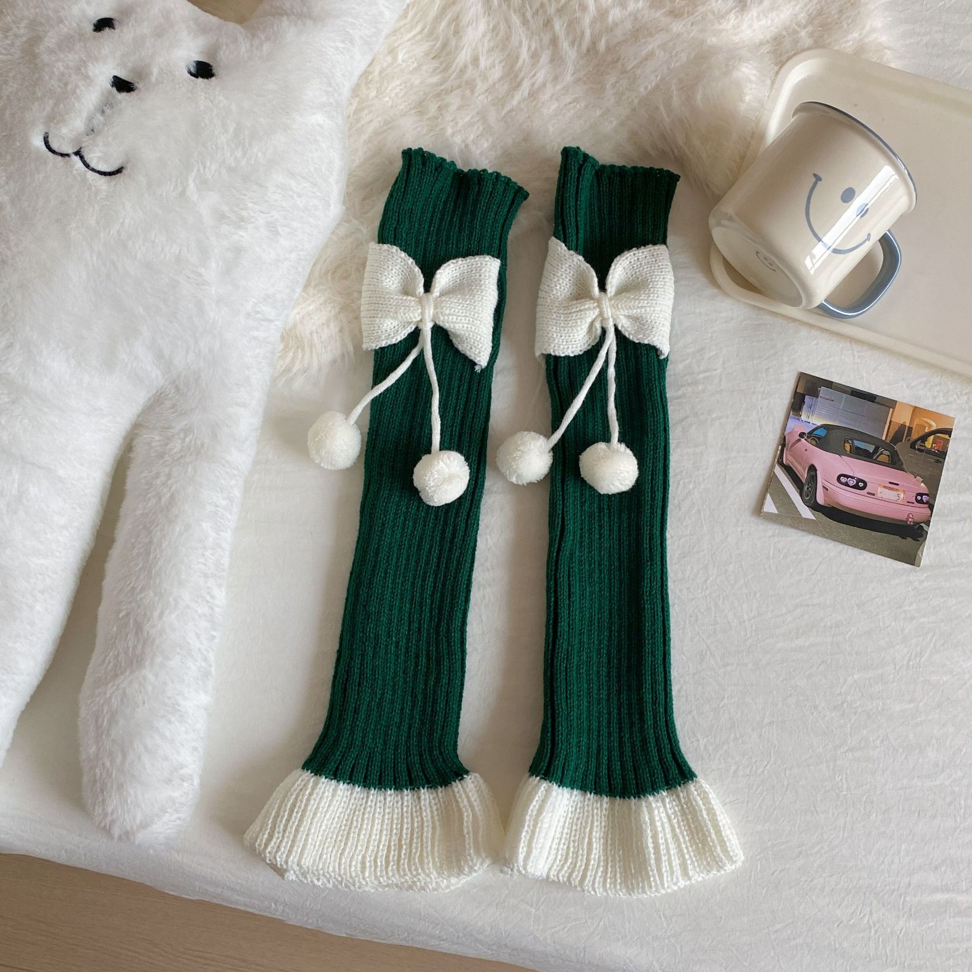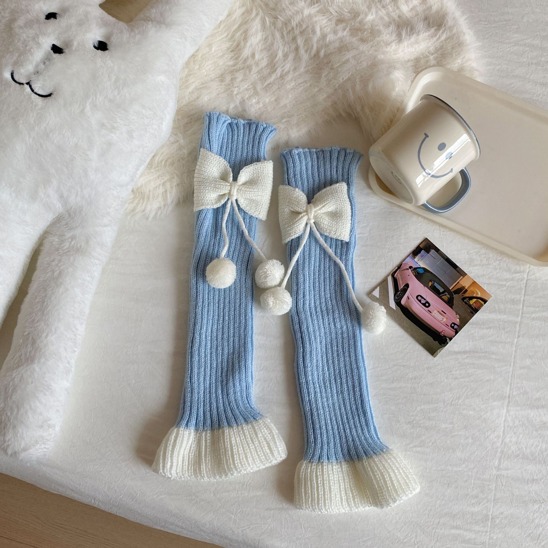 Apparel Accessories Women's Knitted Leg Warmers With Bow & Pompom - Soft Acrylic, High-Cut, Breathable, Non-Slip, Stylish For Winter & Fall