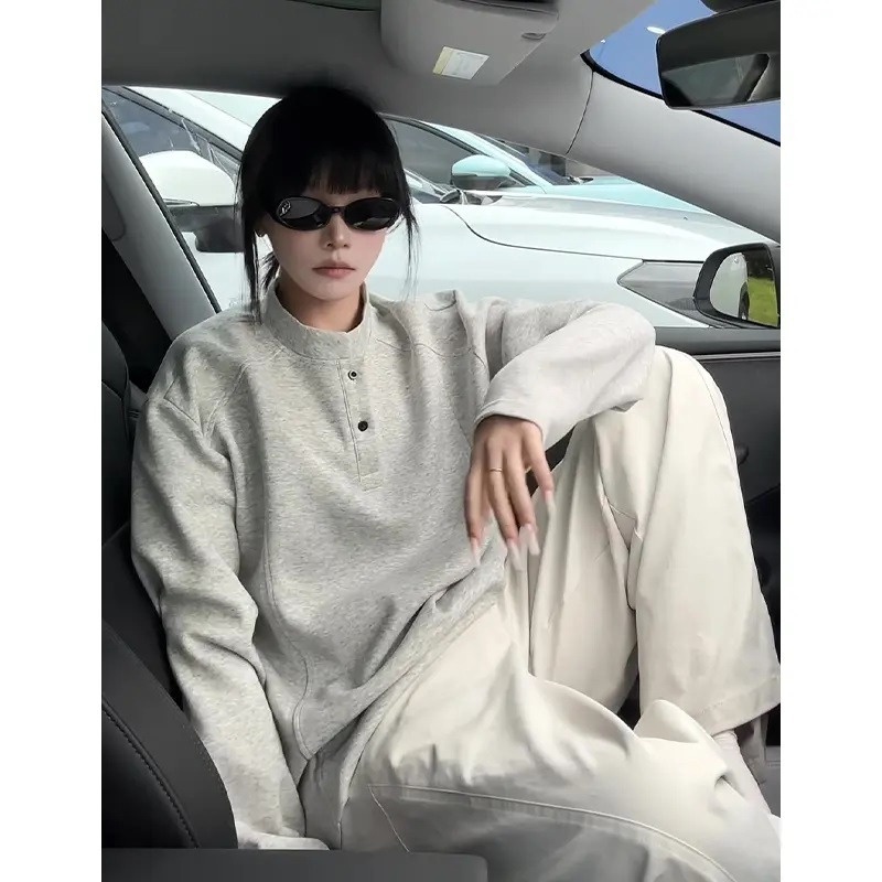 boy Henry Collar Regular Shoulder Sweatshirt For Men, Autumn Cleanfit American Style Deconstructed Patchwork Design Long