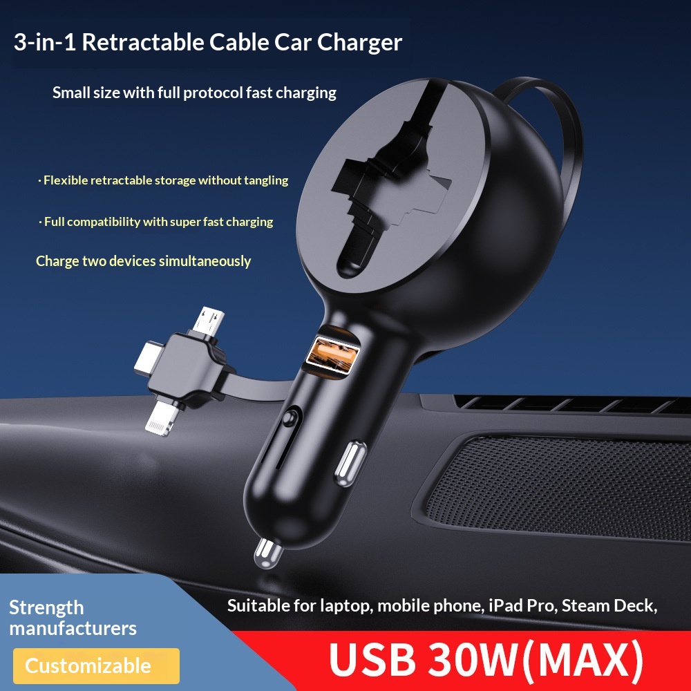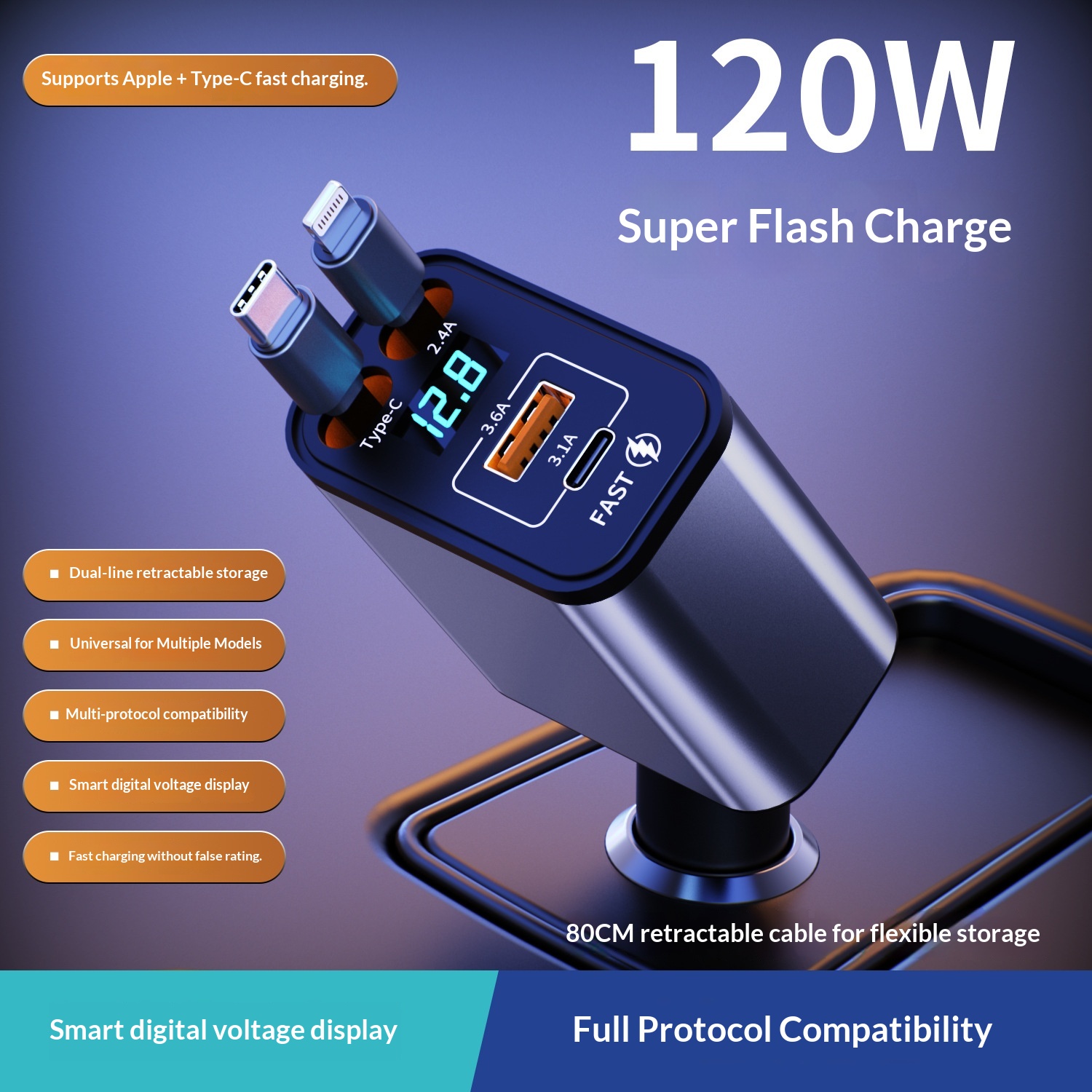 Car Charger Super Multi-Function Cigarette Lighter One-to-Four Retractable Cable PD Fast Charging Mobile Phone Adapter