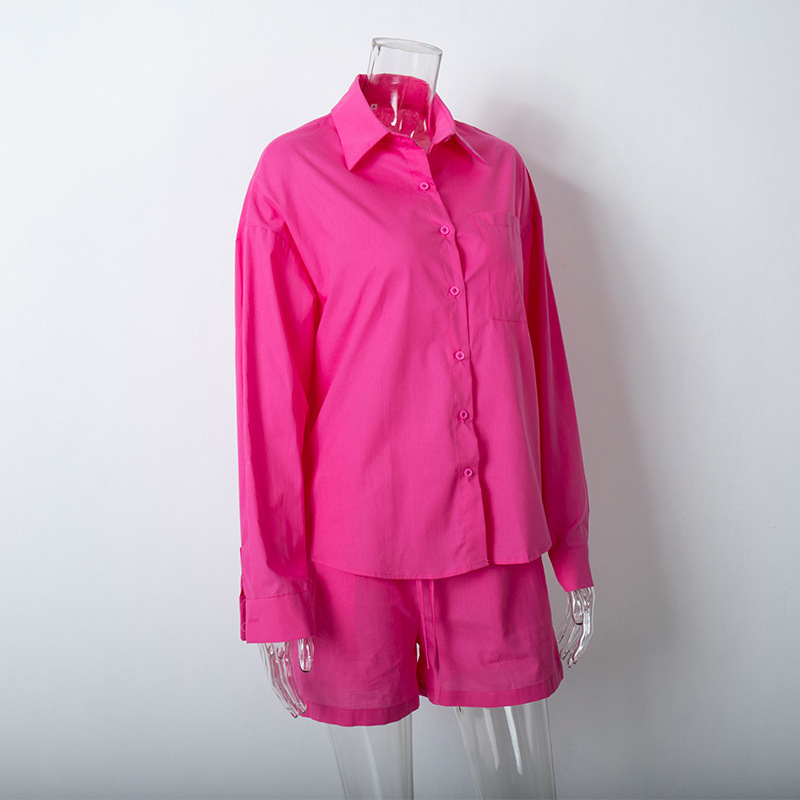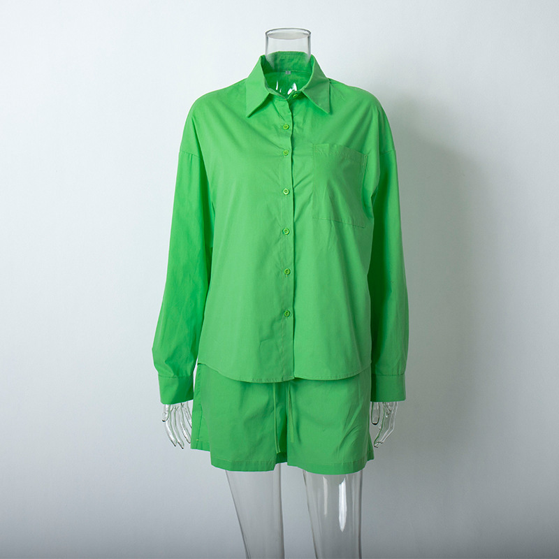 Casual for women's 2024 spring long sleeved shirt top+straight shorts solid color two-piece set