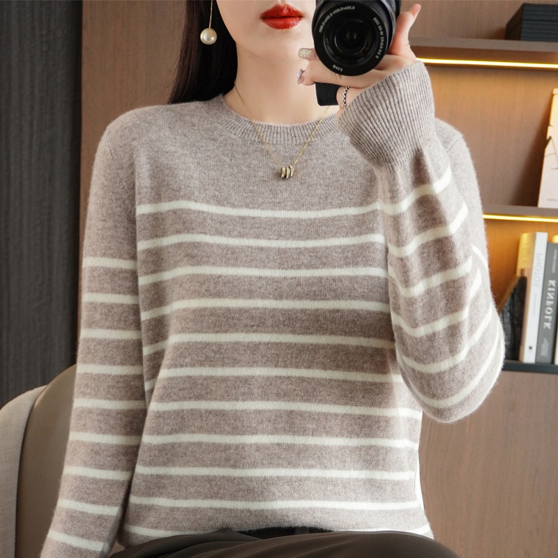 ChicShe ChicShe Women's Round Neck Sweater 2023 Autumn Winter New Long Sleeve Striped Pullover Slimming Knitted Wool Base Shirt