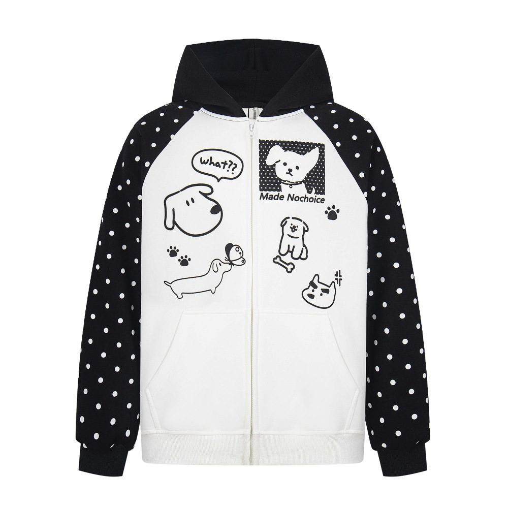 Color Block Patchwork Raglan Sleeve Hooded Jacket Trendy Polka Dot Full Print Fun Cartoon Cardigan Sweatshirt Men's