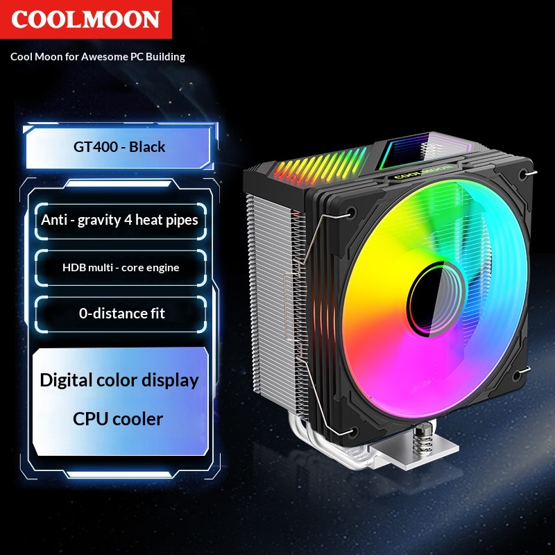 Coolmoon's new product GT400 CPU cooler features a top cover with an infinite lens and digital temperature display, along with ARGB cool lighting and 4 heat pipes for efficient heat transfer, blending performance with cool aesthetics! Cooler packaging: 16 pieces/box, single box size: 52.5*35*42.5cm, 15kg/box, supports cross-border sales, direct brand sales, image packages and authorization are available. For more details, please contact customer service!