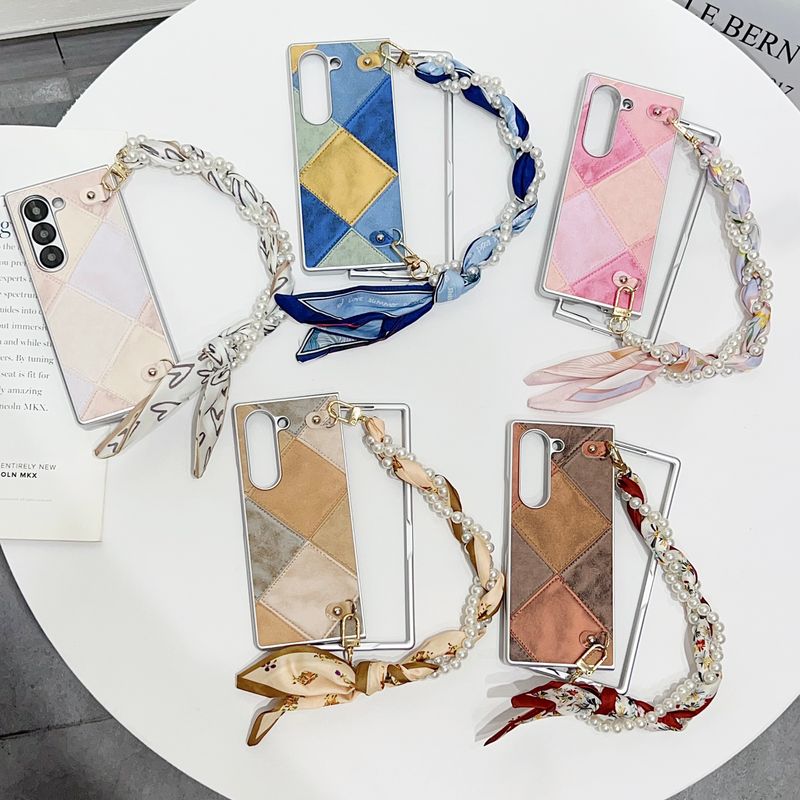 Elegant Retro Contrast Color Blocking Silk Strap Wrist Leather Phone Case Cover For Samsung Galaxy Z FOLD 7 6 5 4 3 5G