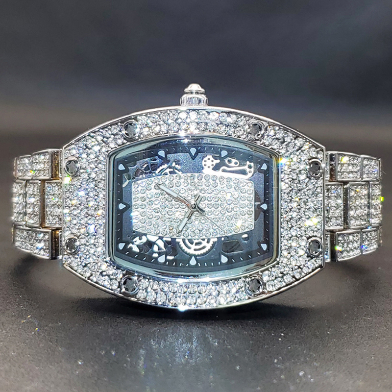 European style watch, hip-hop full diamond color block dial, barrel shaped golden quartz men's watch