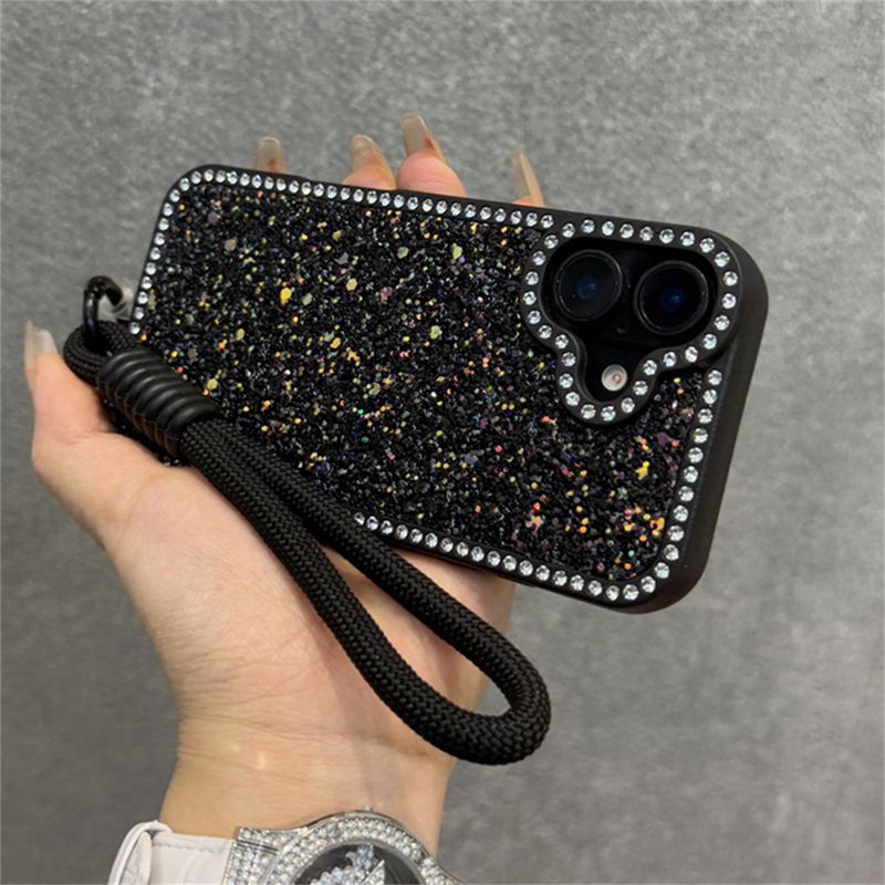 Glitter Sequins Wrist Rope Strap Phone Case for iPhone 16 15 14 13 12 11 Pro Max 16 Plus Rhinestone Frame Protection Back Cover