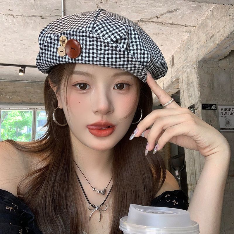 Handmade Button Checkered Women's Hat Black and White Checkered Beret