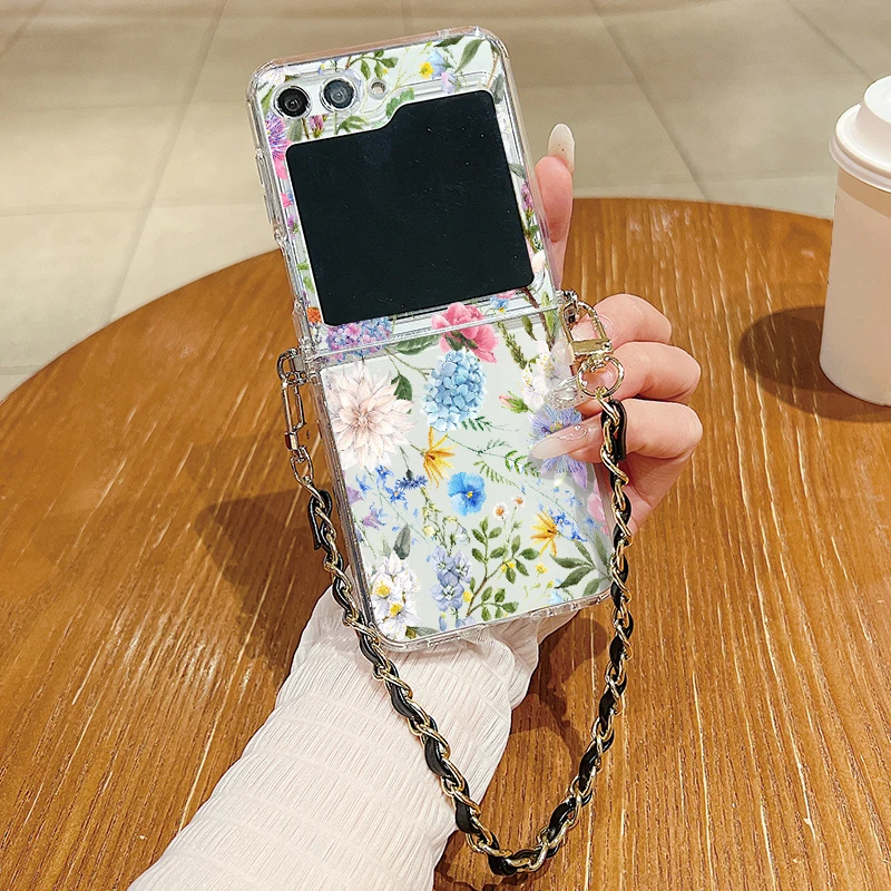 Hydrangea Print Metal Lanyard Case For Samsung Galaxy Z Flip6 Flip5 Flip4 Flip3 Flip 6 5 4 3 Shockproof Clear Soft Phone Cover