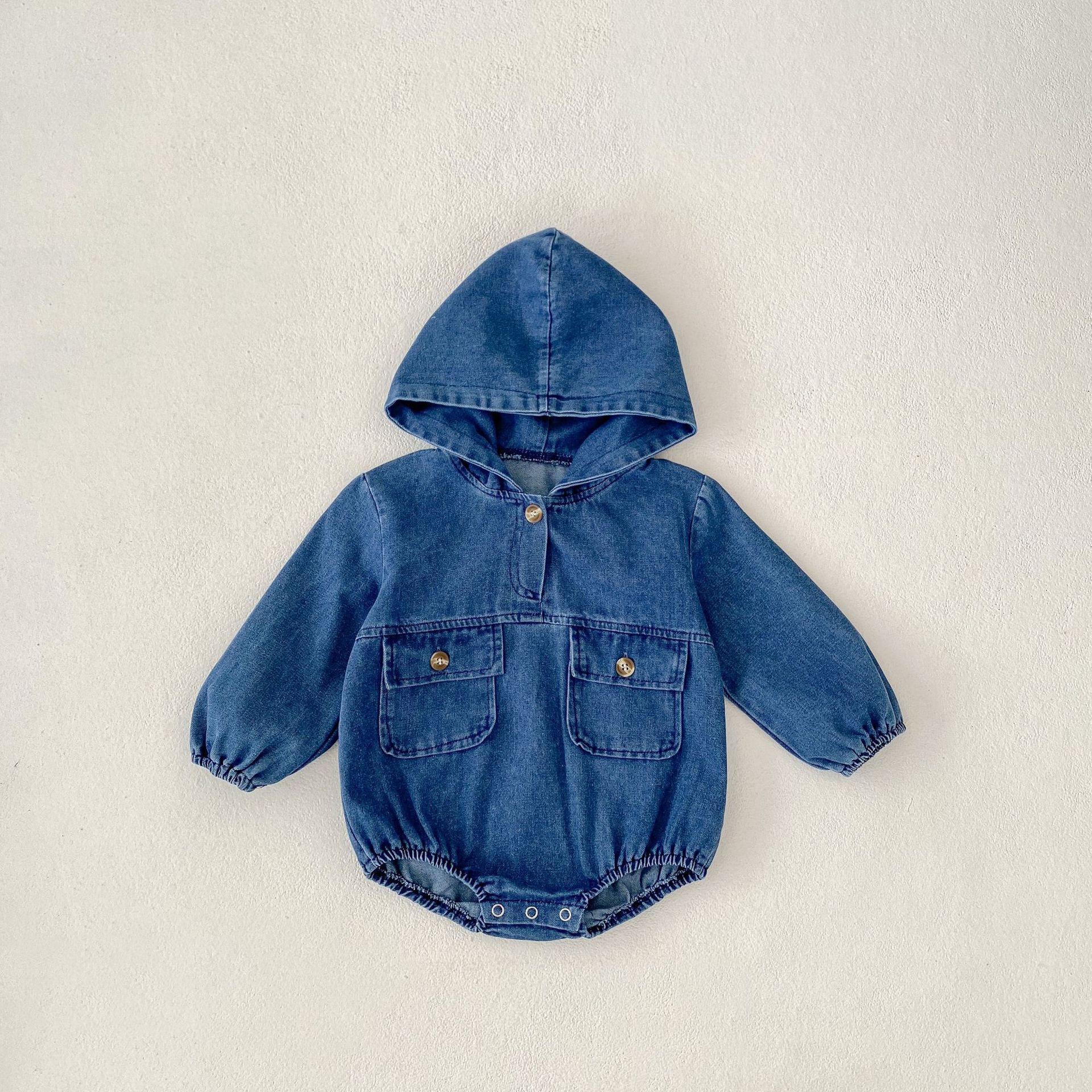 Ins 2024 autumn clothing for infants, young children, boys girls, denim style, hooded, double pocket, long sleeved,
