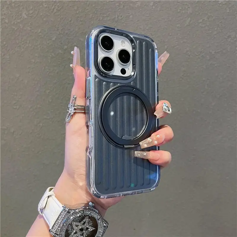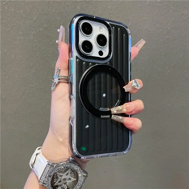 Luggage Corrugated Magnetic Charging Case For IPhone 17 14 15 16 Pro Max Luxury 360 Metal Finger Ring Bracelet Kickstand Cover