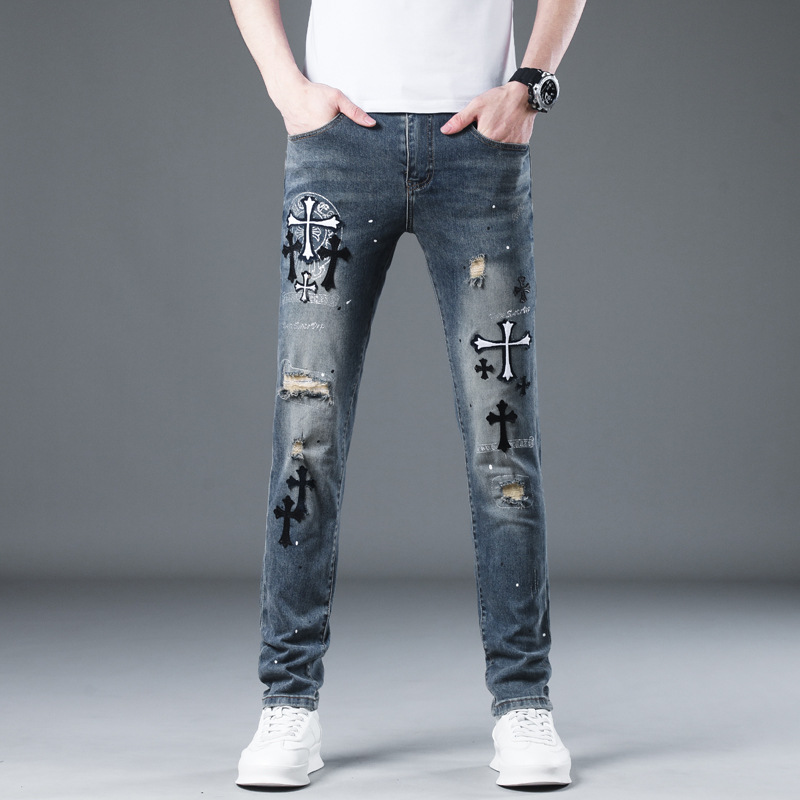Personalized embroidered jeans, men's trend with torn patches, fashionable and versatile elastic slim pants, summer 2023
