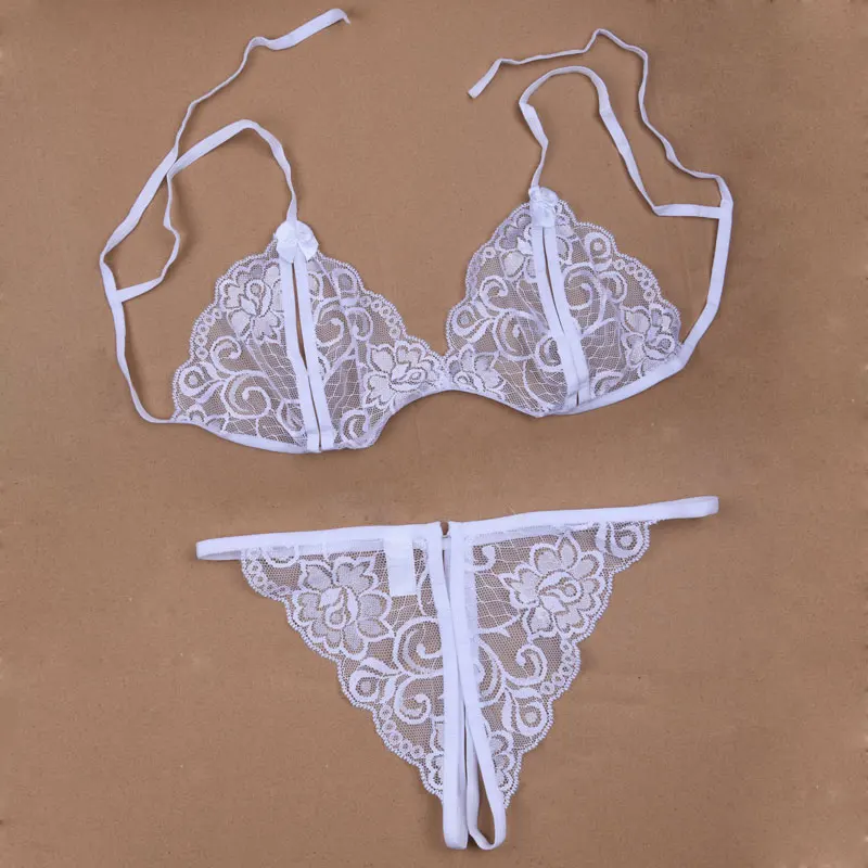 New 4 Pcs Set Women Sexy Underwear Lingerie Hot Erotic Open Bra Crotch Lace Costumes With Bow Garter Belt Fishnet
