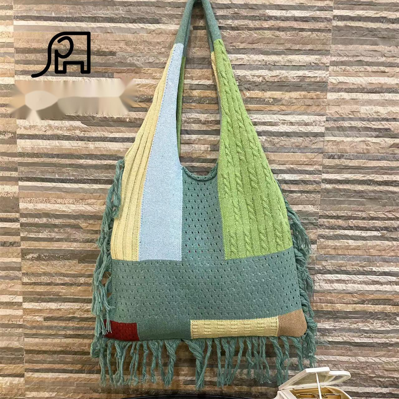 New Cross Border Tassel Women's Splicing Knitted Handheld Shoulder Bag Hot Selling Simple And Versatile Retro Knitted Bag