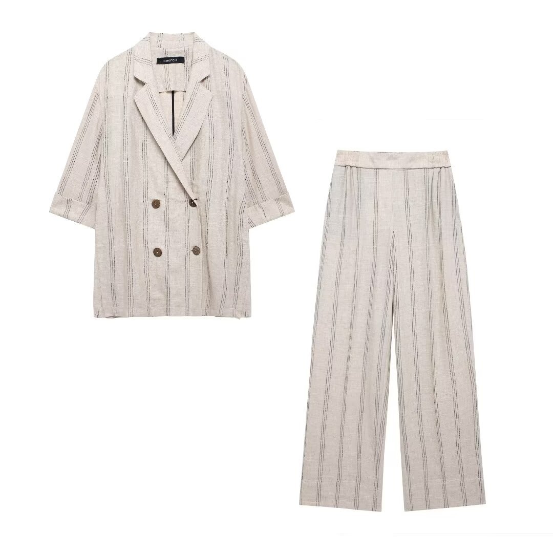 Outer fur women's clothing 2024 summer new linen striped suit jacket pants set