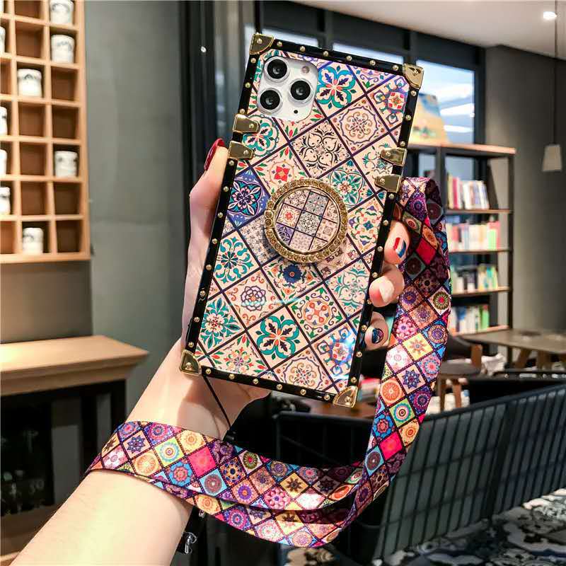 Suitable for iPhone 15 Ethnic Blue Persian Apple 14 Hanging Strap Holder Samsung S24U Square Trendy Brand Phone Case