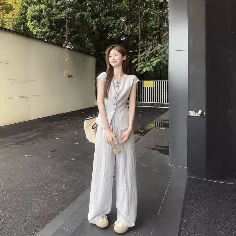 Summer Elegant Simple Tie Waist Slimming Flutter Sleeve Blouse Wide Leg Floor-Length Pants Set 66249