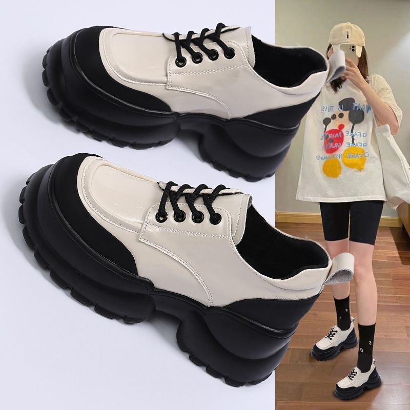 thick soled small leather shoes for women, 2024 autumn new round toe lace up color blocking versatile height