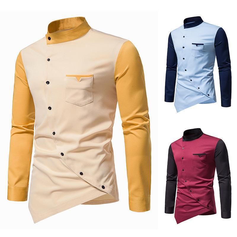 Men's shirt 2025 Spring and Autumn new European size youth personality irregular color collision Henry collar shirt men