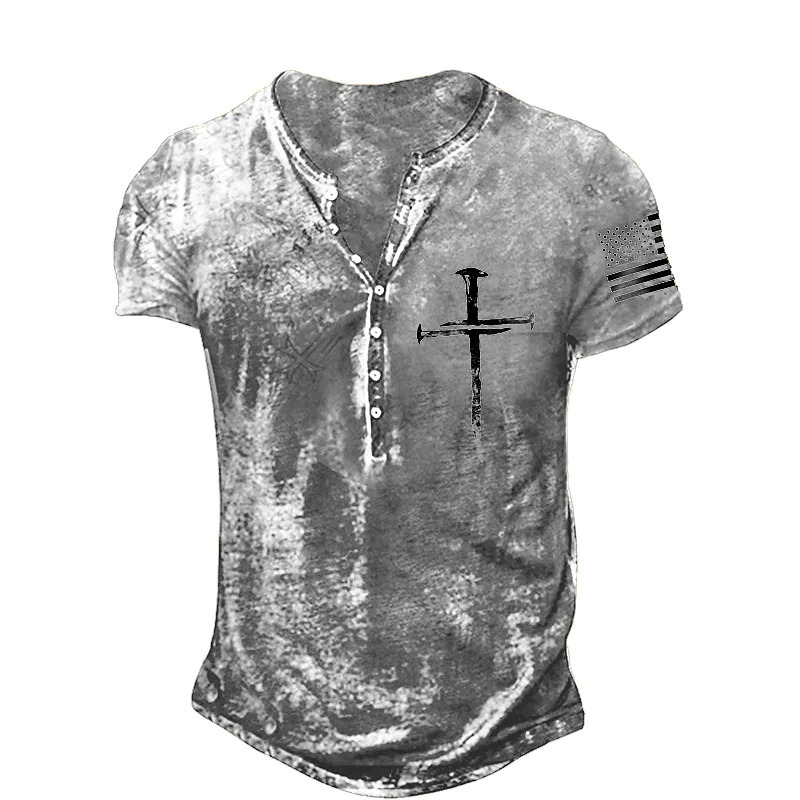 Summer men's digital printed Asian cross pattern Henry shirt with 7 button slim fit short sleeves
