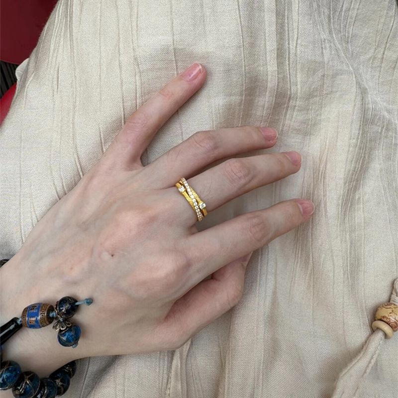 Vintage Gold Double Layer Three Cross Brushed Super Shiny Design Full Circle Zircon Index Finger Ring Versatile Jewelry