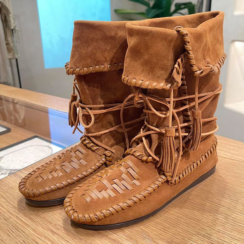 Women Boxing Boots Cowhide Version ~ Niche Inner Height Increase Tassel Woven Lace-Up Boxing Genuine Leather Versatile Slimming Pile Boots