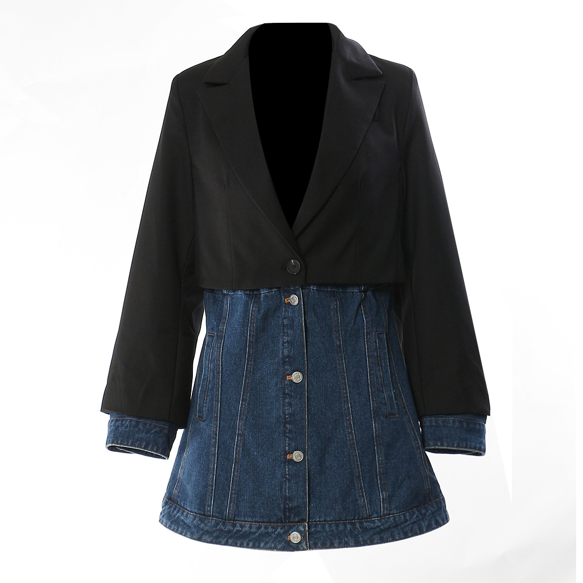 2023 Early Spring New Fake Two-piece Slim Fit Denim Patchwork Suit Mid Length Denim Top Jacket